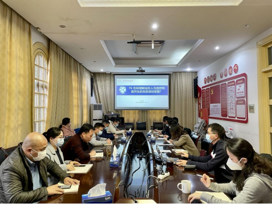 钟毅平以“推动绿色发展,促进人与自然和谐共生”为主题,从背景、现状、如何理解和贯彻等方面阐释了“站在人与自然和谐共生的高度谋划发展”的重要论述和精神。他强调,作为党员干部,必须从小事做起,带头践行绿色、循环、低碳的生活方式;作为高校教育管理者,要以学校获评“湖南省绿色学校创建示范单位”为契机,进一步贯彻落实习近平生态文明思想,坚持把生态文明教育融入育人全过程,引导学生提升生态文明素养,凝心聚力共建“幸福师大”。